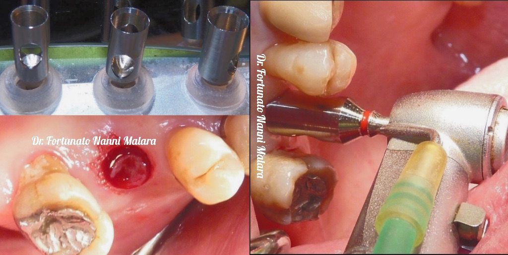Tuttavia, quando ci sono le condizioni cliniche adatte (adeguato spessore osseo e mucoso), per ridurre al minimo il trauma al tessuto osseo/parodontale (e quindi minor disagio per il paziente), l'impianto può essere inserito senza l'apertura del lembo con una tecnica cosiddetta "flapless" che si esegue praticando un opercolo sulla gengiva con l'utilizzo di un bisturi circolare (come dimostrato in figura)